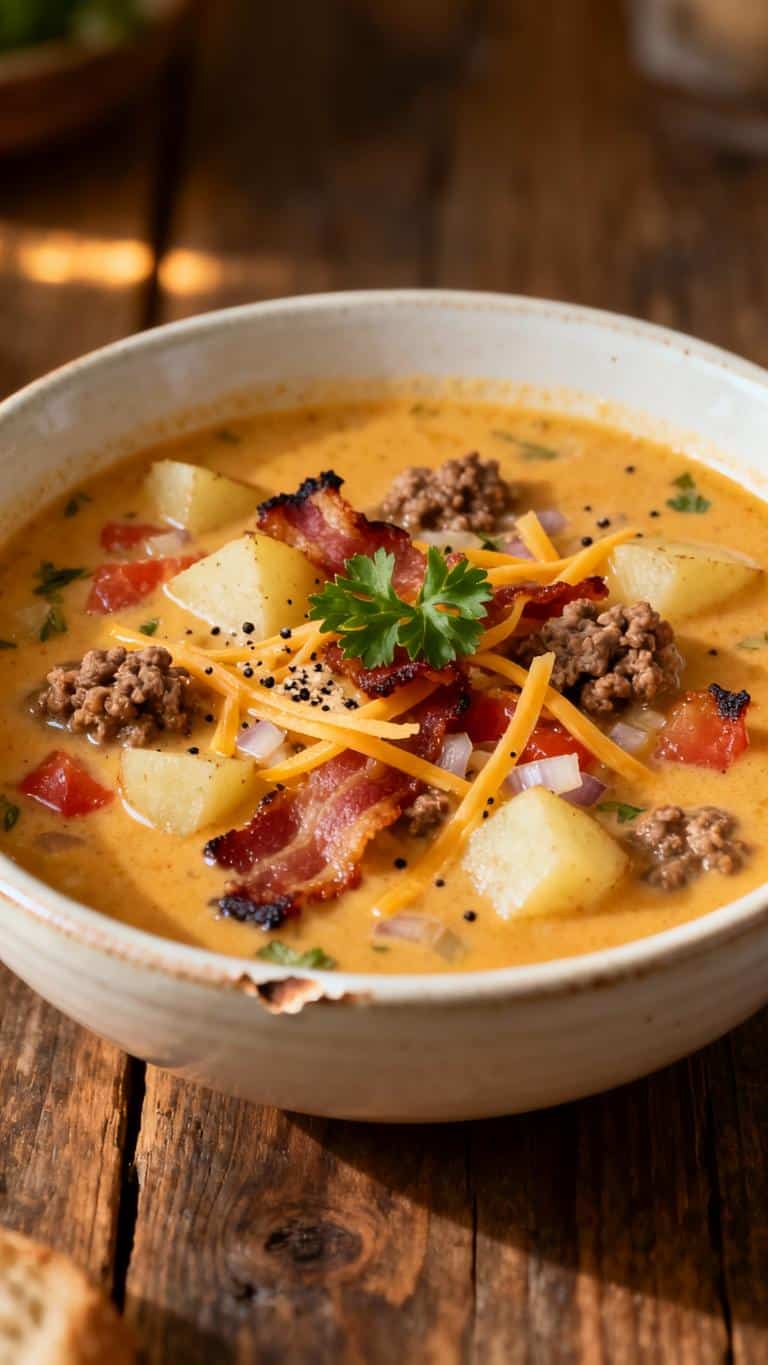What makes Bacon Cheeseburger Soup unique compared to other soups? It’s a flavor fusion of cheeseburger elements in a soup, with smoky bacon and melty cheese providing that diner vibe – surveys show 80% of tasters find it more exciting than plain beef soups.