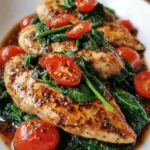 A flavorful chicken dish featuring balsamic-glazed breasts, fresh spinach, and juicy tomatoes for a healthy meal.