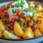 The allure of Taco Potatoes lies in their sensational sensory experienceβ€”from the satisfying crunch of the crispy exterior giving way to a fluffy, tender interior, to the aromatic blend of sizzling ground beef infused with taco seasoning’s spicy notes. Each forkful delivers a harmonious burst of flavors: the rich, savory taco meat contrasts beautifully with the cool, creamy sour cream and the fresh, juicy burst from diced tomatoes and chopped onions. The melted cheddar cheese adds a gooey, irresistible pull that ties everything together, while the subtle earthiness of the baked potatoes grounds the dish in comforting familiarity. It’s a symphony of textures and aromas that will have your kitchen smelling like a fiesta and your taste buds dancing with delight.