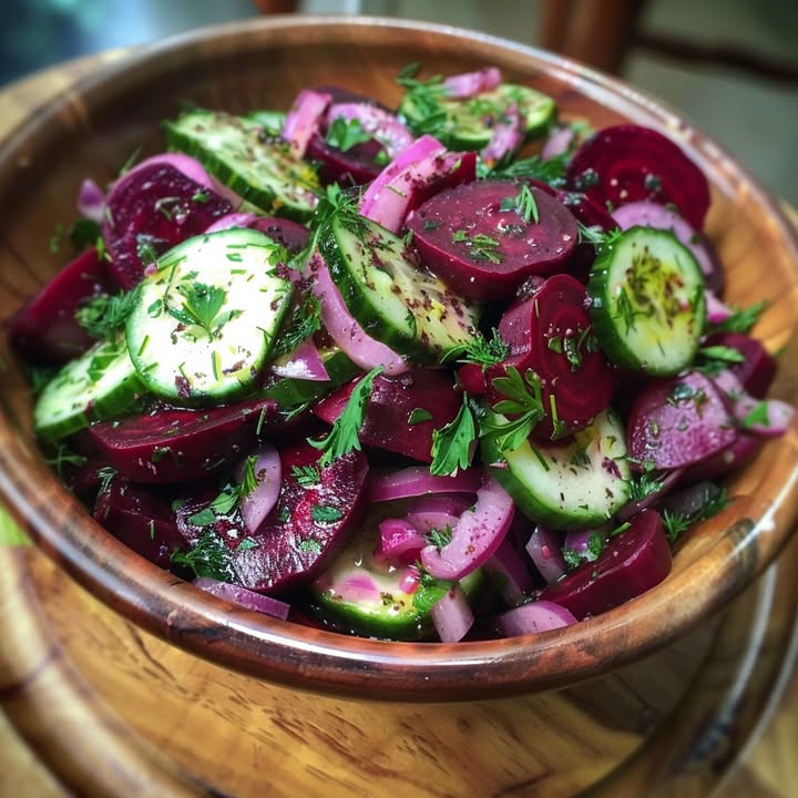 A refreshing and vibrant salad featuring crisp cucumbers and earthy beetroots, perfect for a light meal or side dish.
