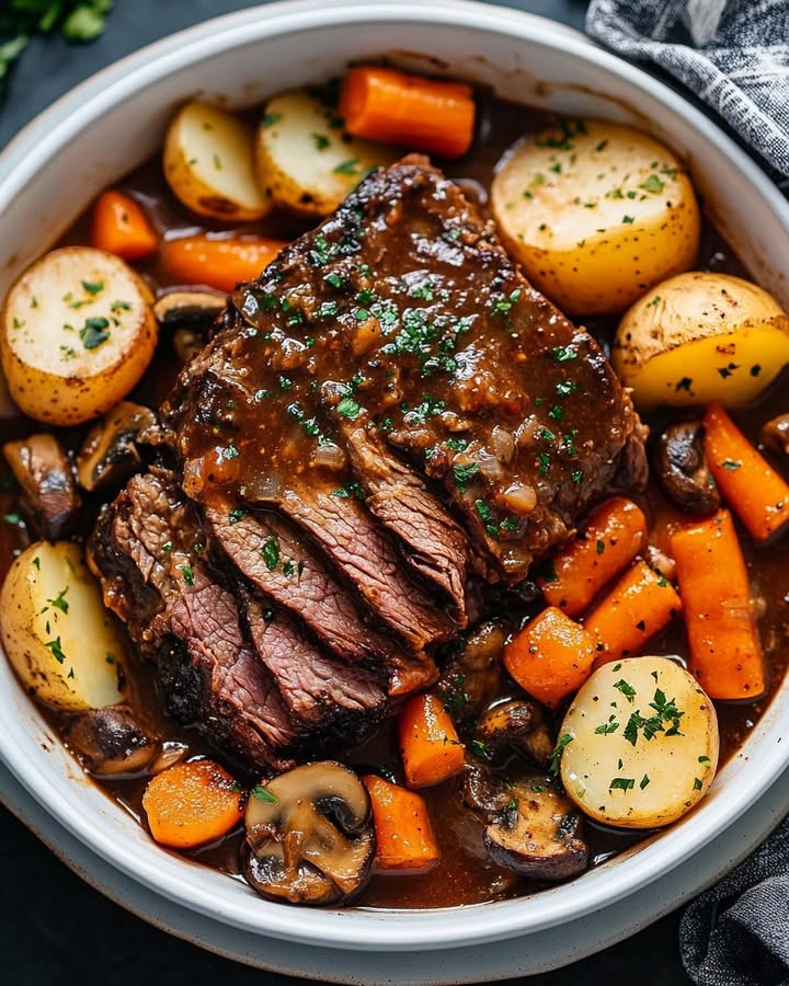 A hearty and comforting dish featuring tender chuck roast slow-cooked with carrots and potatoes in a rich, savory broth.