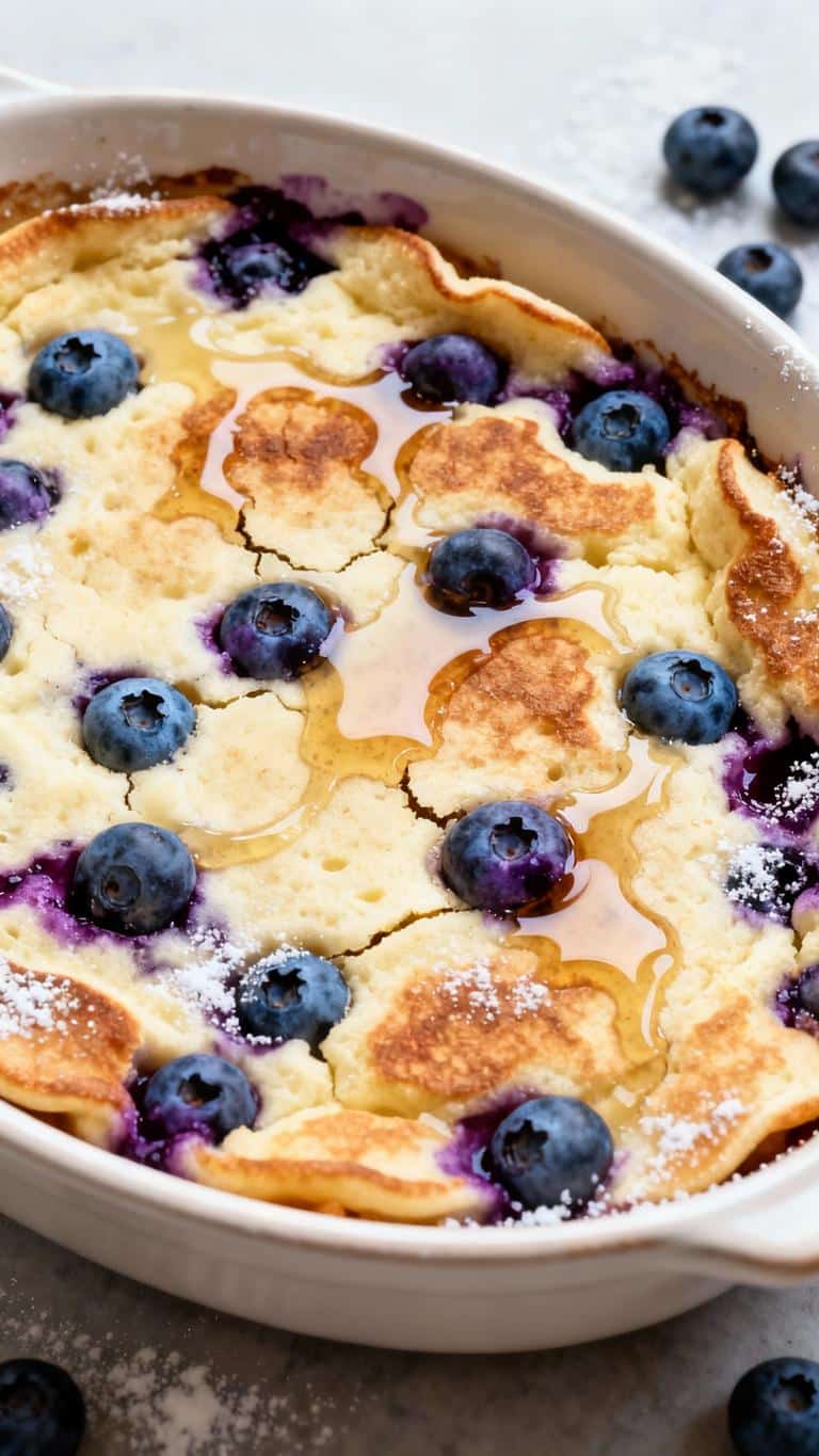 A comforting casserole made with buttermilk pancakes and fresh blueberries, perfect for breakfast or brunch.