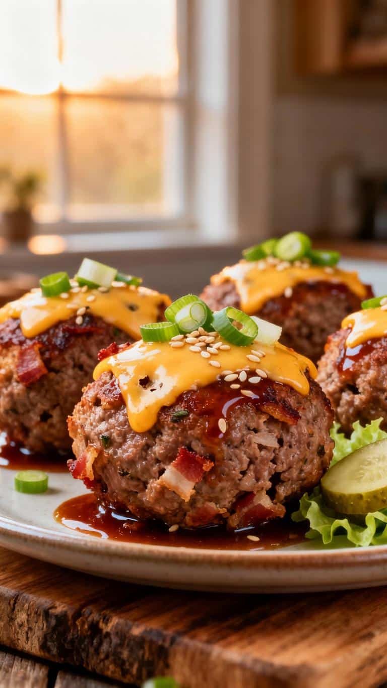 Savory meatballs combining the flavors of bourbon, bacon, and cheese for a unique twist on a classic burger.