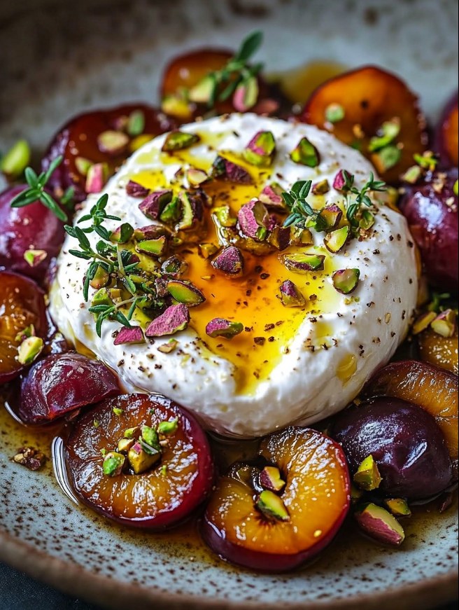 An elegant and simple appetizer featuring creamy burrata cheese paired with sweet roasted plums, crunchy pistachios, and fragrant thyme.