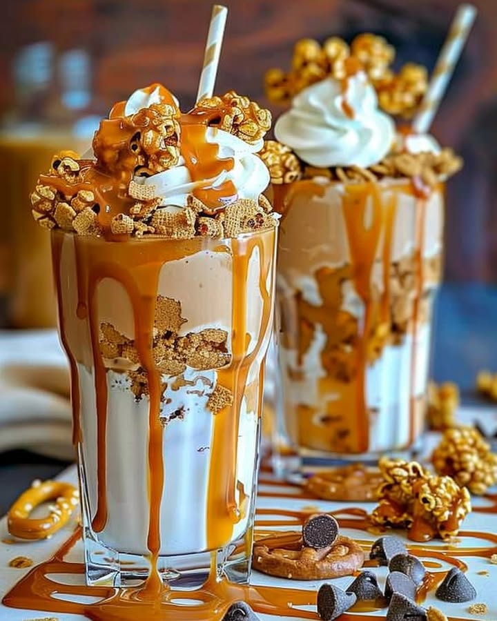 An over-the-top dessert milkshake loaded with vanilla ice cream, caramel sauce, whipped cream, and a crunchy caramel candy topping.
