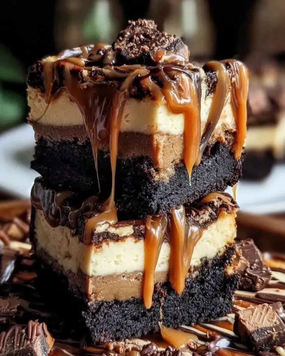 After the initial bake, spread the cream cheese mixture over the brownie base and drizzle 1 cup of warm caramel sauce on top for that signature drip.