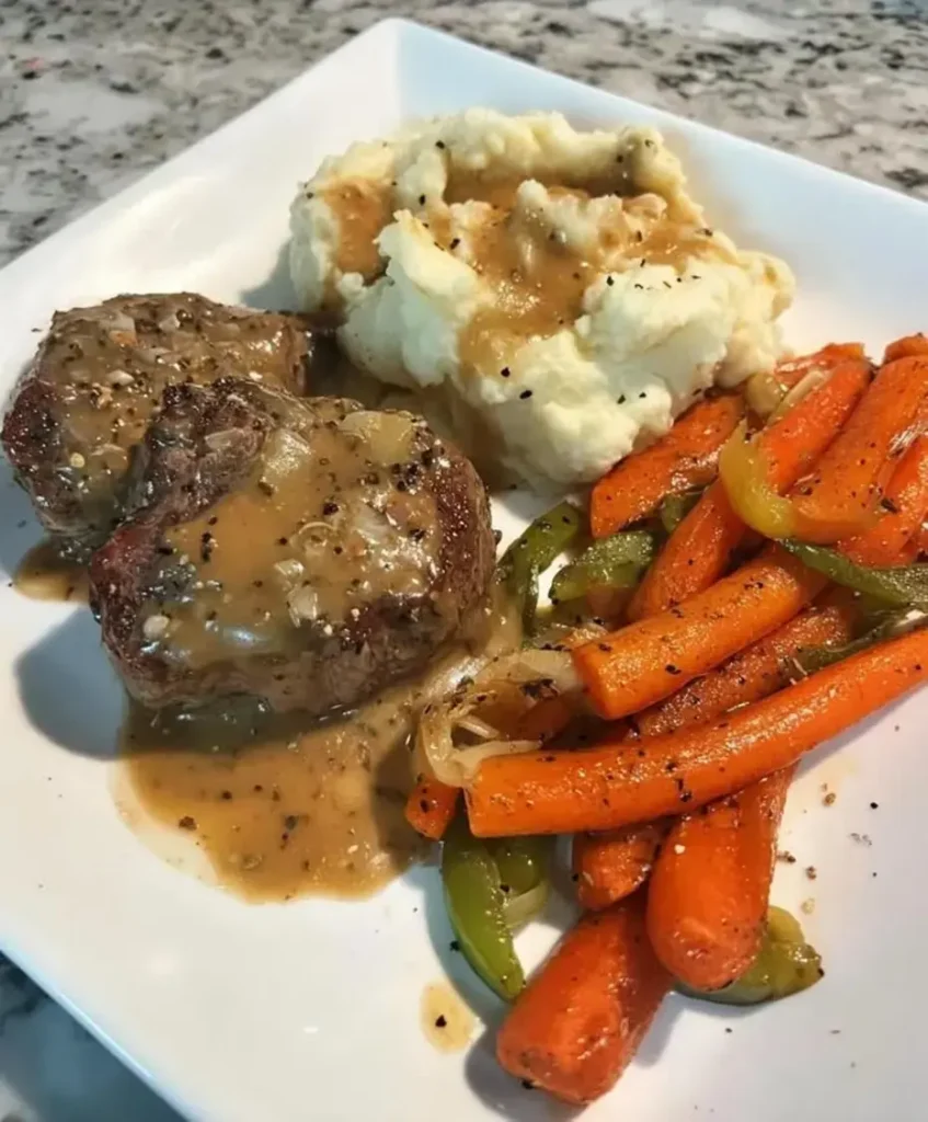 Tender Smothered Beef Chops with Mashed Potatoes and Roasted Carrots