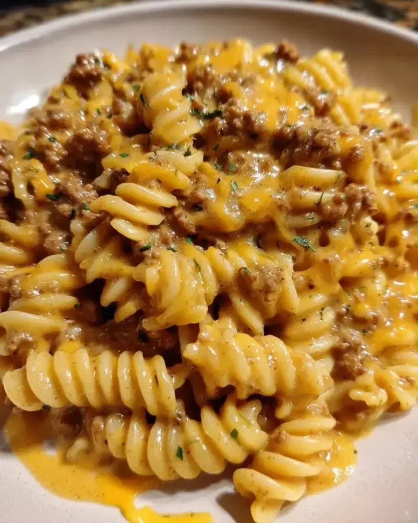 Creamy Ground Beef Rotini with Cheesy Cheddar Parmesan Sauce
