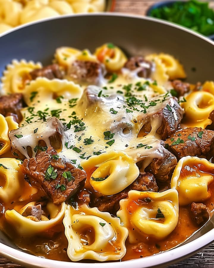 A comforting fusion dish that combines the classic flavors of a Philly cheesesteak with cheesy tortellini in a creamy, savory Provolone sauce.