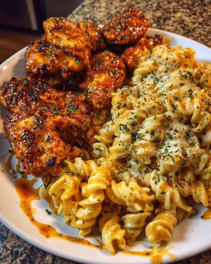 Cheesy Alfredo Rotini with Cajun-Spiced Garlic Chicken Bites