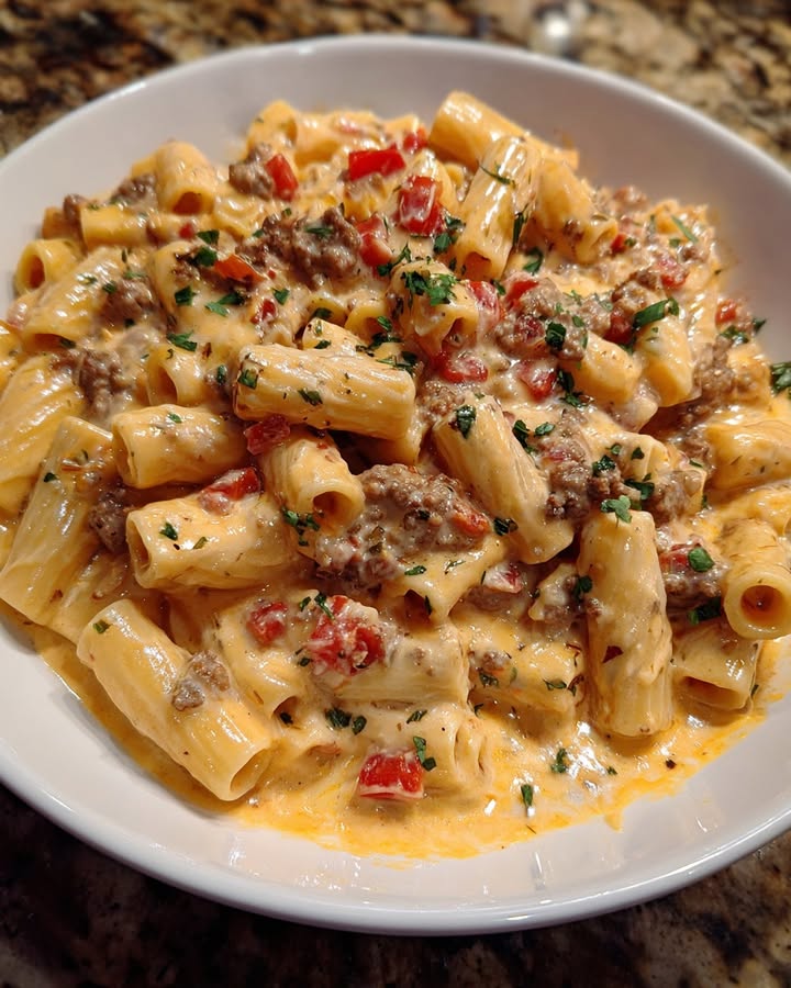 A comforting and incredibly creamy pasta dish featuring seasoned ground beef, hearty rigatoni, and a rich, cheesy sauce made with Velveeta and zesty Rotel tomatoes.