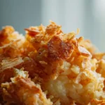 While the casserole is baking, in a separate bowl, combine the crushed cornflakes cereal with the remaining 1/2 cup of melted butter. Stir until the cornflakes are fully coated, creating a crunchy topping that’s ready to add contrast to the creamy base. After the initial 45 minutes of baking, remove the dish from the oven and evenly sprinkle this mixture over the top.