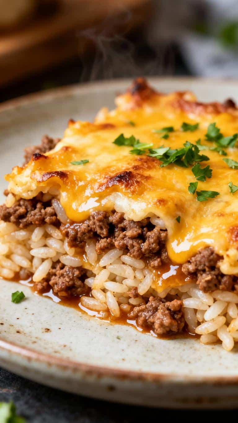 This hearty casserole combines ground beef, rice, and cheese for a comforting family meal.