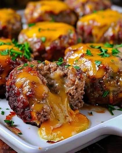 A fun and flavorful twist on classic meatloaf. These individual-sized bites are stuffed with a gooey, melted cheese center, making them a perfect appetizer or main course.