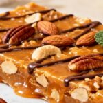 A classic holiday treat featuring buttery toffee topped with chocolate and nuts.