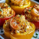 Delicious bell peppers stuffed with a savory mix of crab and shrimp, baked to perfection for a seafood delight.
