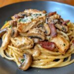 A creamy pasta dish featuring tender chicken, crispy bacon, and earthy mushrooms in a rich sauce.