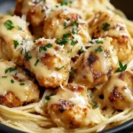 The allure of this Creamy Parmesan Pasta with Garlic Butter Chicken Bites lies in its irresistible sensory experience. Picture succulent chicken bites, seared to golden perfection in garlicky butter, offering a crispy exterior that gives way to juicy tenderness. The sauce is a luxurious blend of heavy cream and freshly grated Parmesan, creating a silky, ultra-creamy texture that coats each strand of al dente fettuccine. Aromas of minced garlic and melted butter fill the air, evoking the warmth of an Italian trattoria, while subtle notes of salt and pepper enhance the overall harmony. Every forkful delivers a perfect balance of creamy richness, savory chicken, and herbaceous freshness from the parsley garnish.