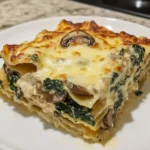 A creamy lasagna featuring layers of spinach, mushrooms, and cheese, perfect for a comforting meal.
