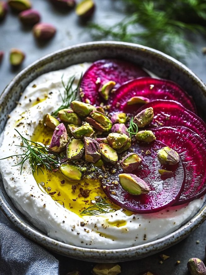 A stunning and flavorful appetizer featuring a smooth, tangy whipped feta base topped with sweet and tangy marinated beetroot, fresh dill, and crunchy salted pistachios.