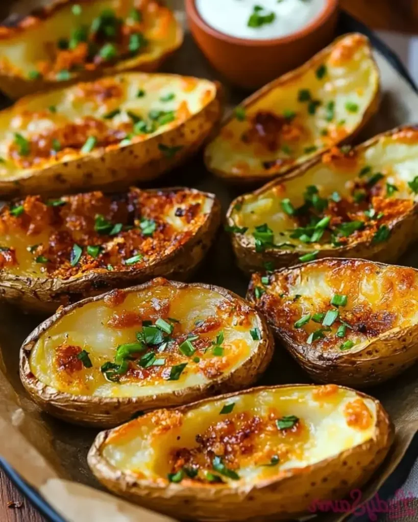 Crispy and flavorful potato skins baked in the oven until golden brown, perfect as an appetizer or snack.