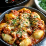 A hearty crockpot dish featuring stuffed pasta shells filled with cheese and meat, slow-cooked for a comforting meal.