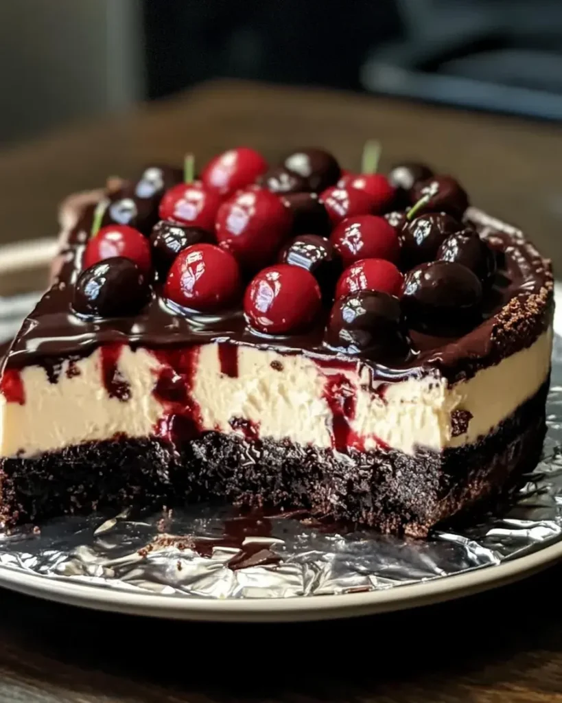 A decadent cheesecake featuring layers of chocolate, cherries, and cream cheese.
