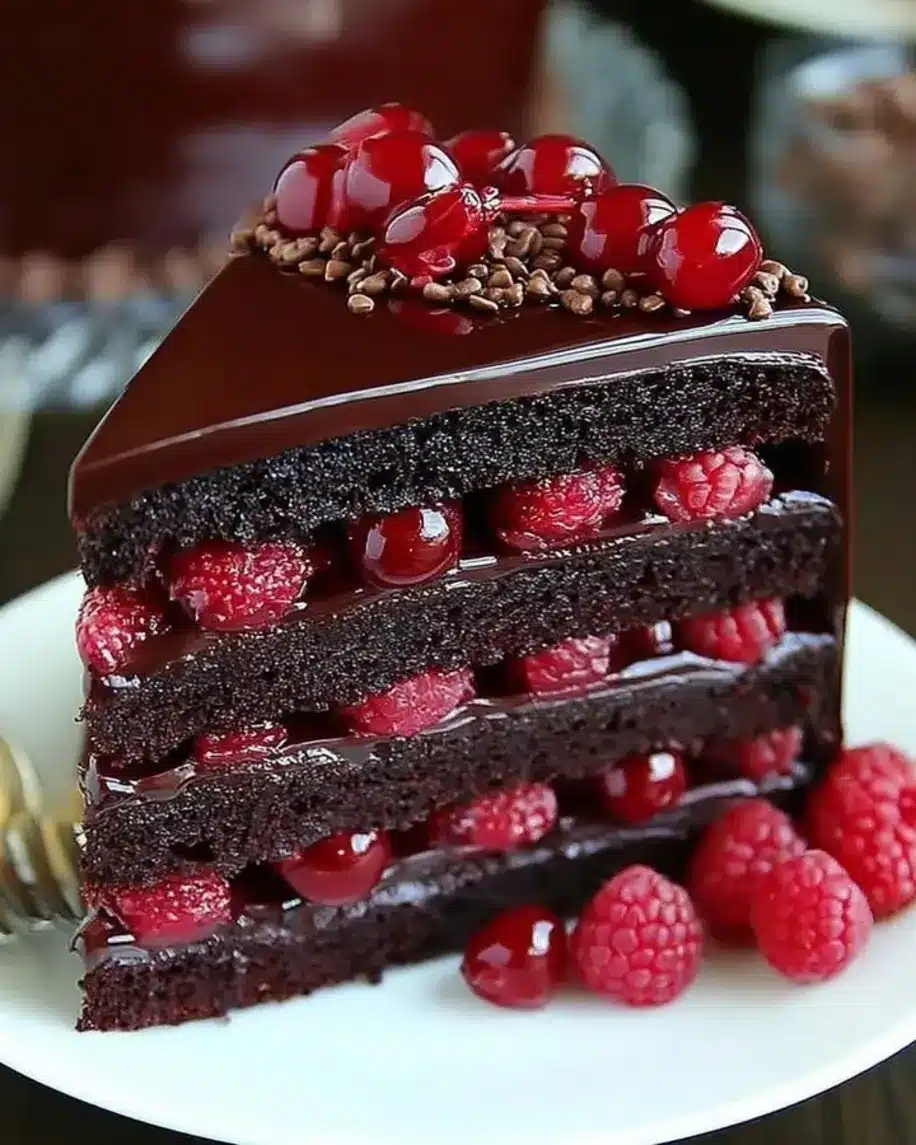 The aroma of warm dark chocolate fills the air as you pull this Decadent Chocolate Raspberry Truffle Cake from the oven, its glossy surface hinting at the silky truffle interior. Each bite offers a symphony of textures: the crisp edge of the cake giving way to a gooey, melt-in-your-mouth center, studded with bursts of tart, juicy raspberries that contrast beautifully with the deep, bittersweet notes of premium chocolate. The raspberries add a fresh, vibrant tang that cuts through the richness, creating a harmonious blend that’s both comforting and exciting. Picture the glossy ganache topping glistening under soft light, releasing an intoxicating scent that draws everyone to the table, making this chocolate raspberry truffle cake an unforgettable experience for your taste buds.