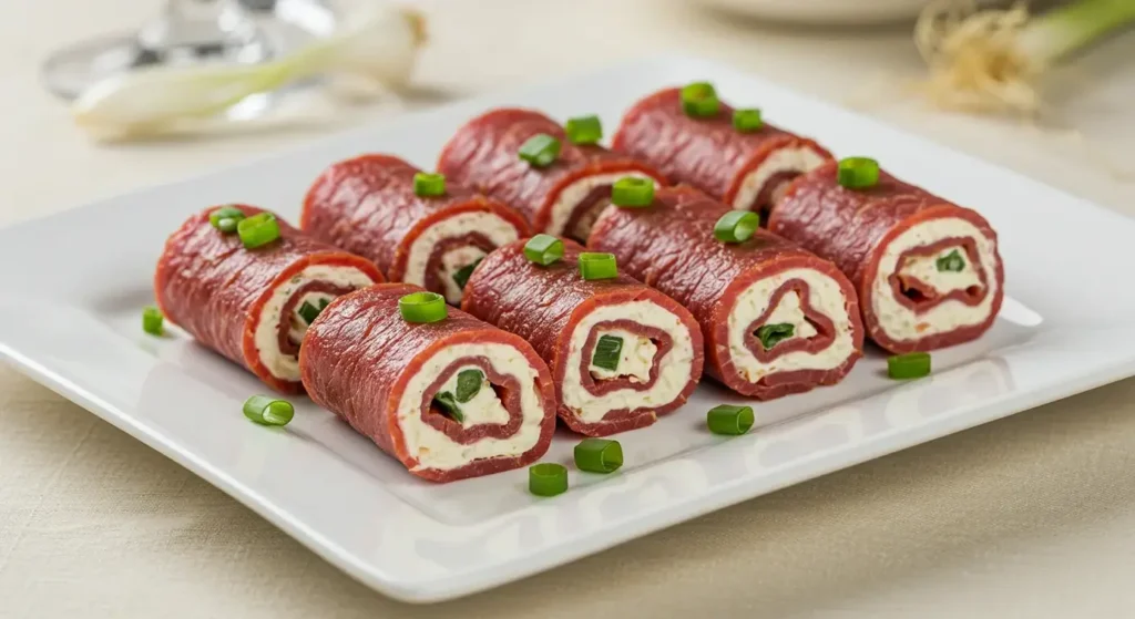 To make dried beef roll ups from scratch, start by softening 8 ounces of cream cheese and mixing it with 1/2 cup sour cream until smooth. Stir in 2 tablespoons chopped green onions, chopped dried beef from a 2.5-ounce jar, 1/2 teaspoon garlic powder, and 1/2 teaspoon onion powder. Spread the mixture on tortillas, roll them up, chill for at least an hour, and slice. This extra creamy method ensures a crave-worthy appetizer that’s simple and delicious.
