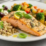 Good side dishes to pair with this easy Mediterranean salmon with herbs include roasted vegetables like zucchini and bell peppers for a nutrient-packed balance, or a fresh quinoa salad to absorb the flavorful juices. These options complement the dish’s light profile, making it a complete main course that’s both satisfying and healthful. For a more indulgent twist, serve with couscous or a Greek-inspired tzatziki to round out the flavors seamlessly.