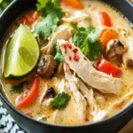 The moment you take your first sip, you’ll be enveloped by the rich, creamy texture of coconut milk blended seamlessly with the zesty kick of red curry paste and fresh lime. Picture tender chicken pieces mingling with crisp bell peppers and earthy mushrooms, all infused with the fragrant aroma of garlic and ginger that fills your kitchen. This Thai chicken soup recipe easy flavorful comfort in a bowl offers a symphony of flavors—spicy, sweet, and savory—creating a velvety broth that’s not just hearty but also incredibly satisfying. The ultra-creamy coconut base ensures every bite has a luxurious mouthfeel, making it feel indulgent without being heavy.