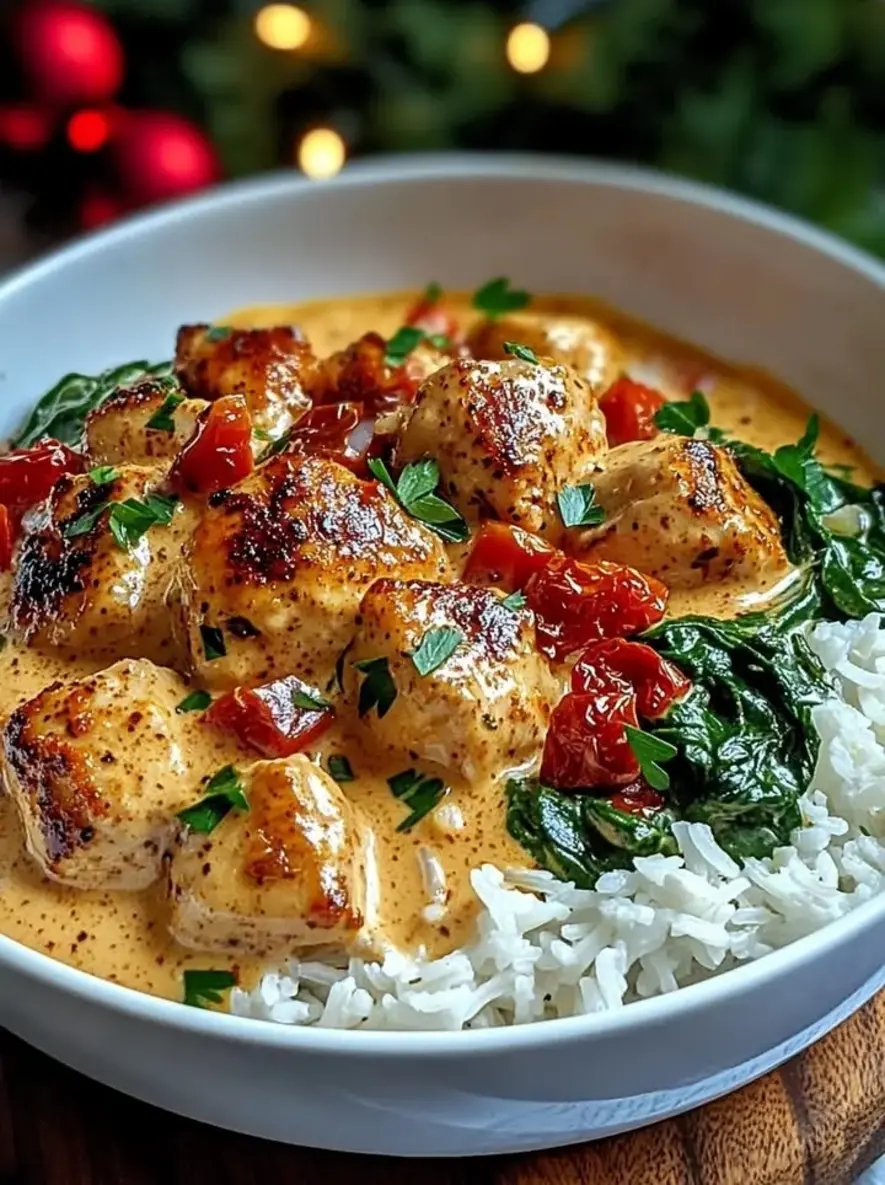 The aroma of Fire-Kissed Velvet Paprika Chicken with Spinach, Sun-Dried Tomatoes & Chili Yogurt Jasmine Rice fills your kitchen with an irresistible blend of smoky paprika, tangy sun-dried tomatoes, and the subtle kick of chili yogurt-infused jasmine rice. Every bite offers a symphony of textures: the velvet-smooth chicken contrasts beautifully with the fresh crunch of spinach and the chewy sun-dried tomatoes, all harmonizing with the fluffy, slightly spicy rice. Picture the tender chicken yielding effortlessly to your fork, while the sun-dried tomatoes burst with concentrated sweetness, and the chili yogurt adds a creamy heat that lingers just right. This isn’t just a meal; it’s a flavorful journey that awakens your senses and leaves you craving more.