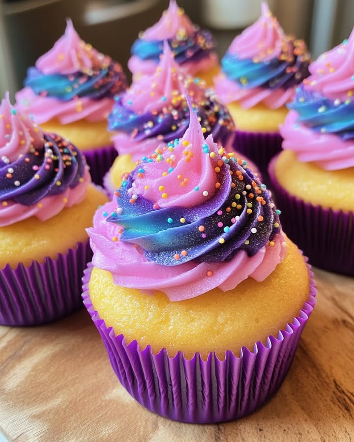Out-of-this-world cupcakes with a vibrant citrus flavor and a cosmic swirl of purple and blue frosting, topped with sparkling sugar for a stellar treat.