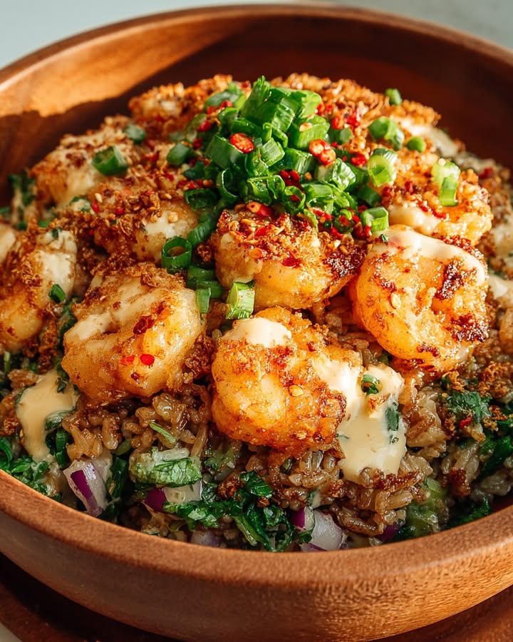 A vibrant and satisfying salad featuring succulent garlic shrimp, fresh greens, and a unique, tangy dressing made with crispy rice for texture.