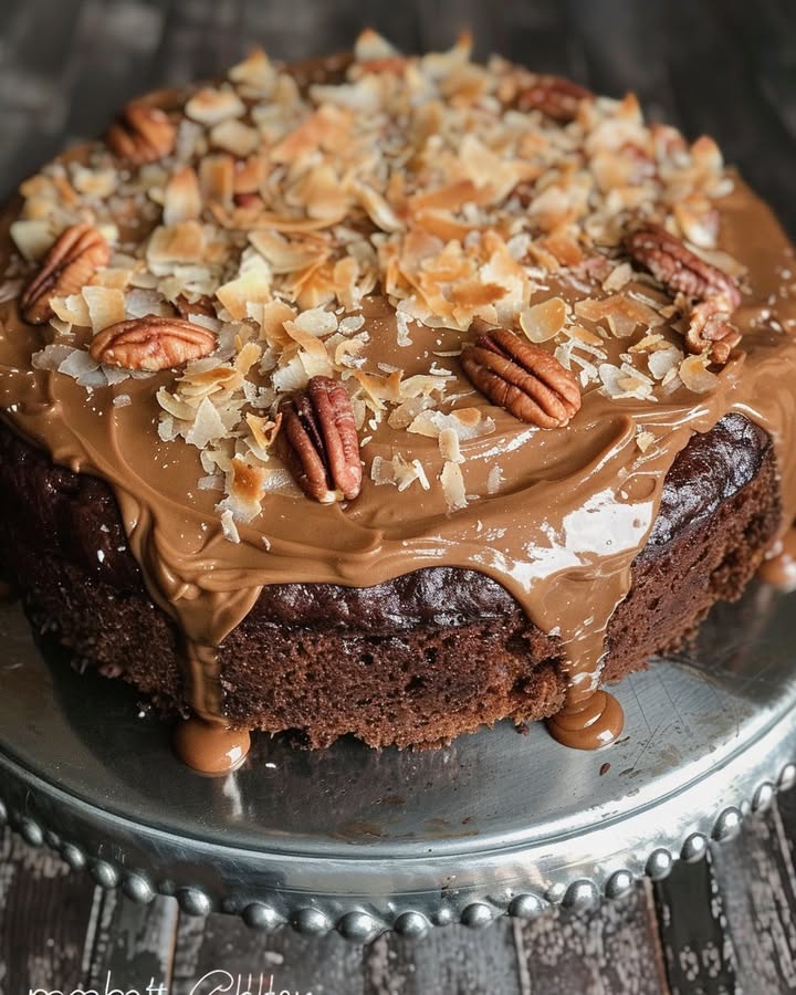 A rich and decadent layered chocolate cake topped with a signature coconut-pecan frosting.