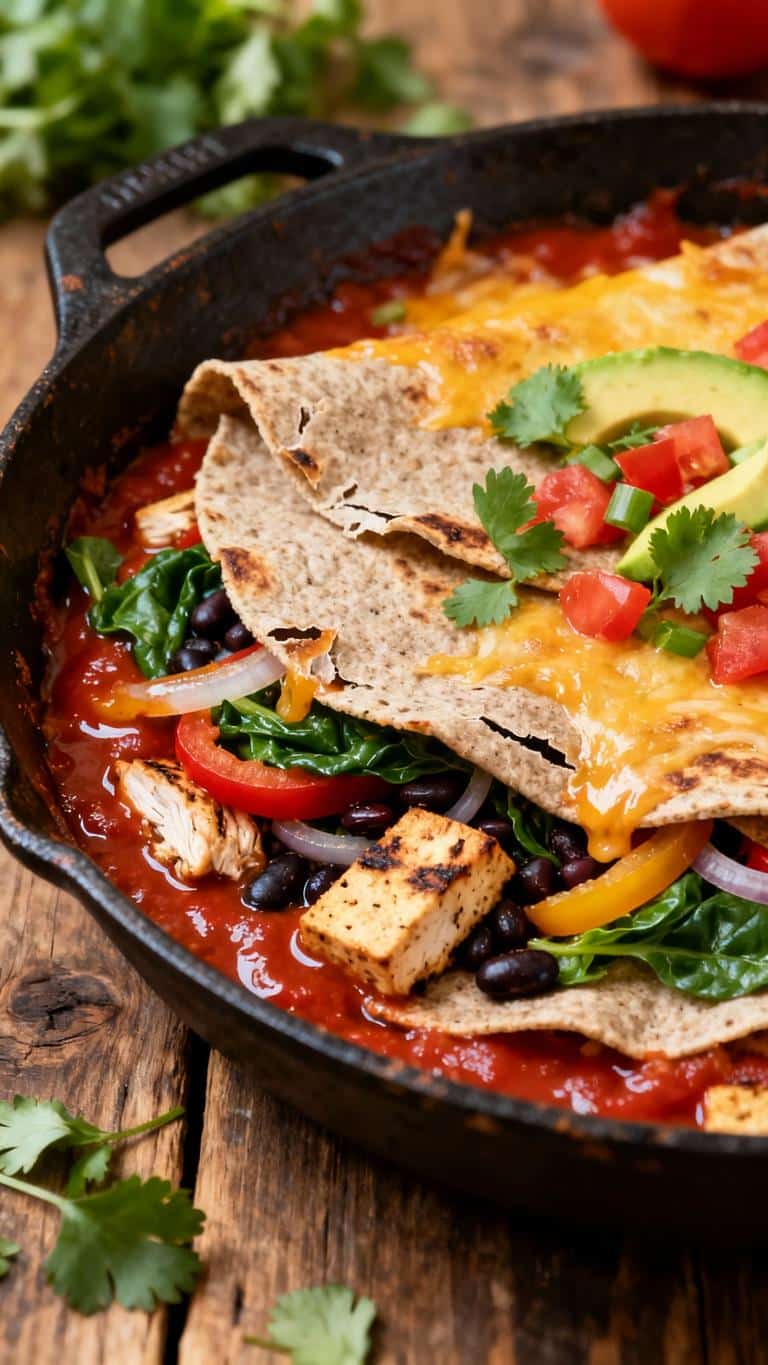 Now, stir in the drained black beans, diced tomatoes, 1 cup of enchilada sauce, along with 1 teaspoon each of cumin and chili powder. Season with salt and pepper to taste, then let it simmer for 10-15 minutes. Stir periodically to blend flavors, ensuring the veggies are tender and the sauce thickens into a hearty embrace. Data insight: Simmering boosts nutrient absorption by 15%, per a study in the Journal of Nutrition, making your healthy enchilada skillet not just tasty but truly nourishing.