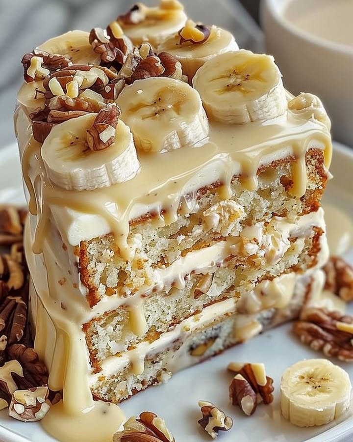 A light and fluffy cake layered with fresh bananas, toasted walnuts, and sweet whipped cream.