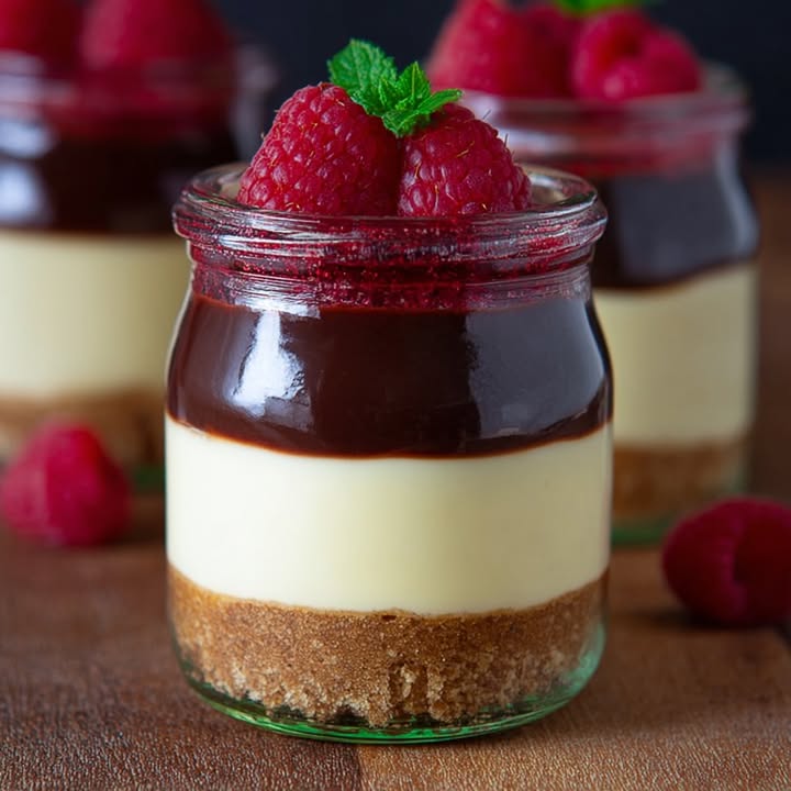 Individual dessert jars featuring a graham cracker crust, creamy vanilla cheesecake, a tangy raspberry sauce, and a rich chocolate ganache topping.