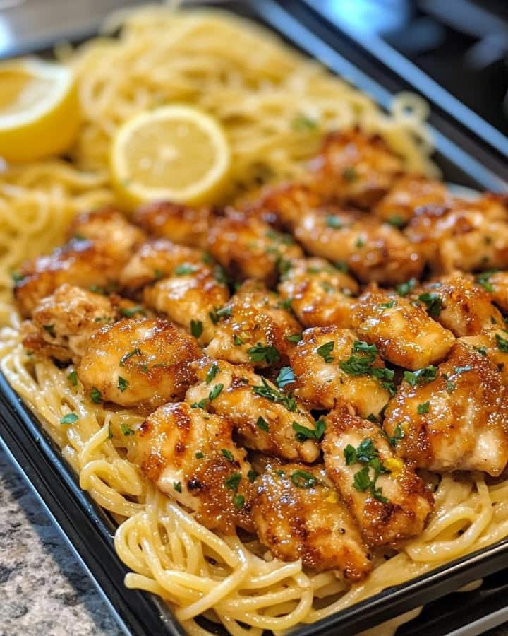 Tender, pan-seared chicken bites in a bright lemon butter sauce served over a bed of creamy, cheesy spaghetti.