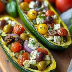 Stuffed zucchini boats filled with Mediterranean flavors like tomatoes, olives, and feta cheese, perfect for a healthy dinner.