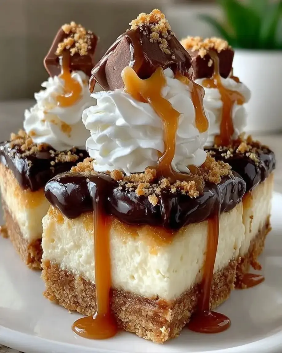 Elevate your No Bake Milky Way Cheesecake Bars with creative plating by arranging them on a rustic wooden board alongside fresh berries for a pop of color and contrast. Garnish with a dollop of whipped topping and a sprinkle of crushed Milky Way pieces to enhance the visual appeal and add extra texture. For an impressive presentation, drizzle with melted chocolate or caramel sauce just before serving, making these easy Milky Way desserts a centerpiece at any gathering.