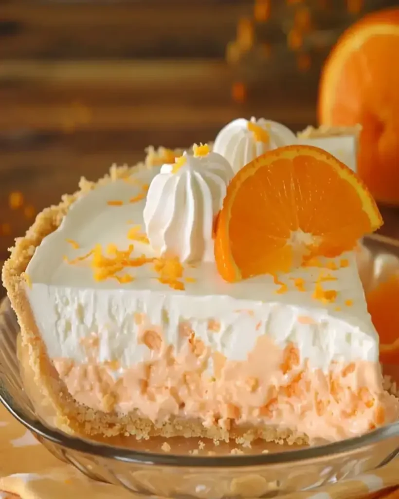 A no-bake pie featuring a creamy orange filling in a graham cracker crust, perfect for a refreshing dessert.
