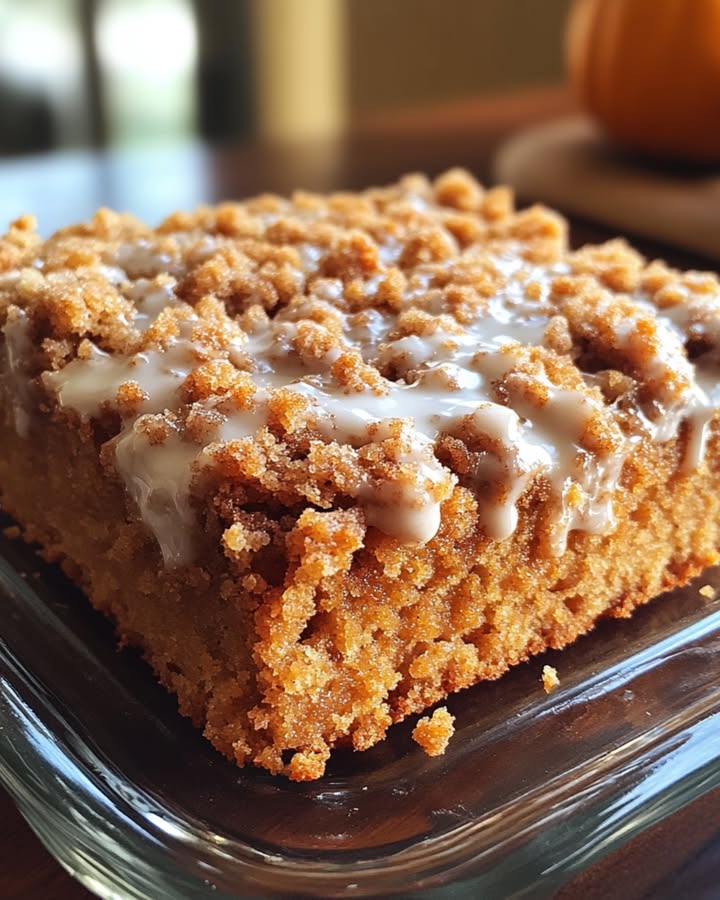 A moist and tender pumpkin cake topped with a generous, buttery spiced crumb topping. Perfect for a cozy fall breakfast or dessert.