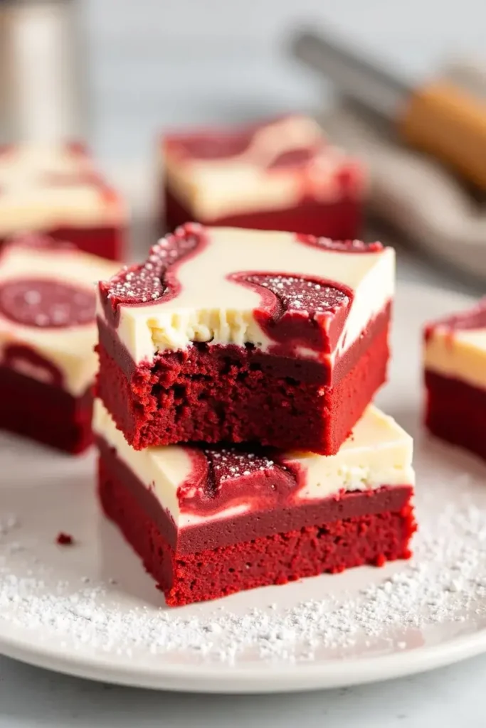 Elevate your Red Velvet Cheesecake Brownies with creative plating by dusting them with powdered sugar or a light cocoa powder for a elegant touch. Garnish with fresh berries like raspberries or strawberries to complement the tangy cheesecake swirl and add a pop of color. For an impressive presentation, serve on a decorative platter with whipped cream dollops or a drizzle of chocolate sauce. These brownies pair wonderfully with a scoop of vanilla ice cream for a decadent dessert, or as a standalone treat alongside coffee for an afternoon pick-me-up. In American cuisine, they shine as the perfect ending to a holiday meal or paired with light main courses like grilled chicken salad to balance flavors.