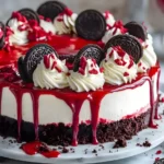 A decadent cheesecake combining red velvet cake with Oreo cookies, featuring a creamy filling and chocolatey crust.