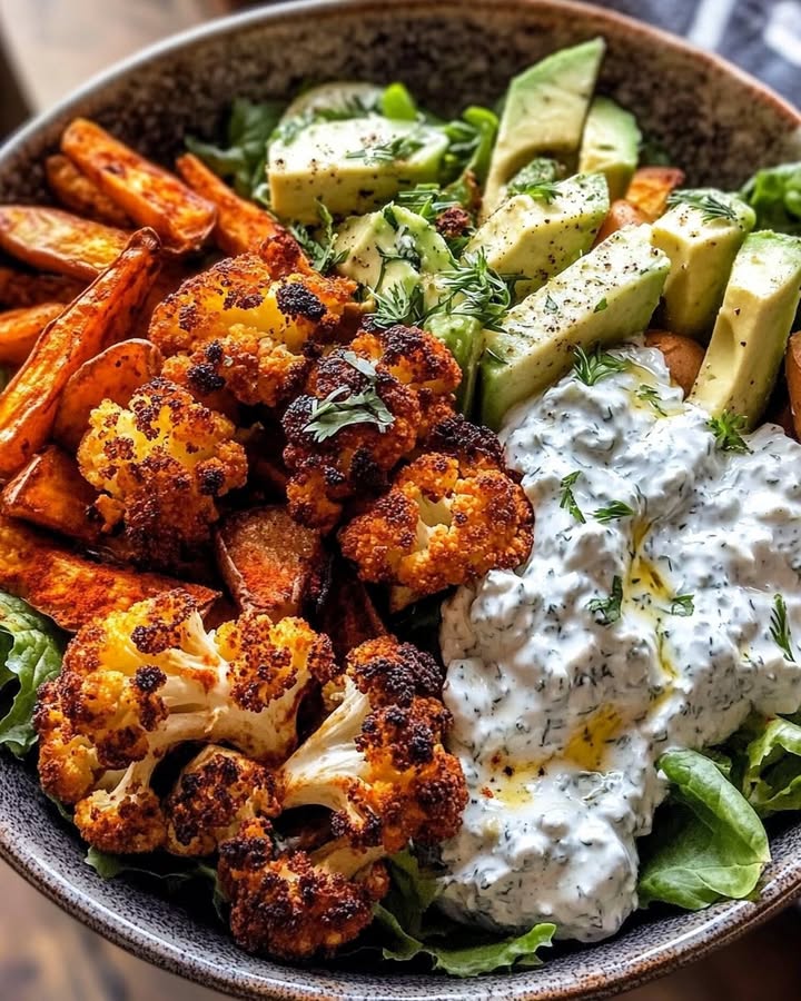 Roasted Cauliflower and Sweet Potato Bowl with Tzatziki and Feta