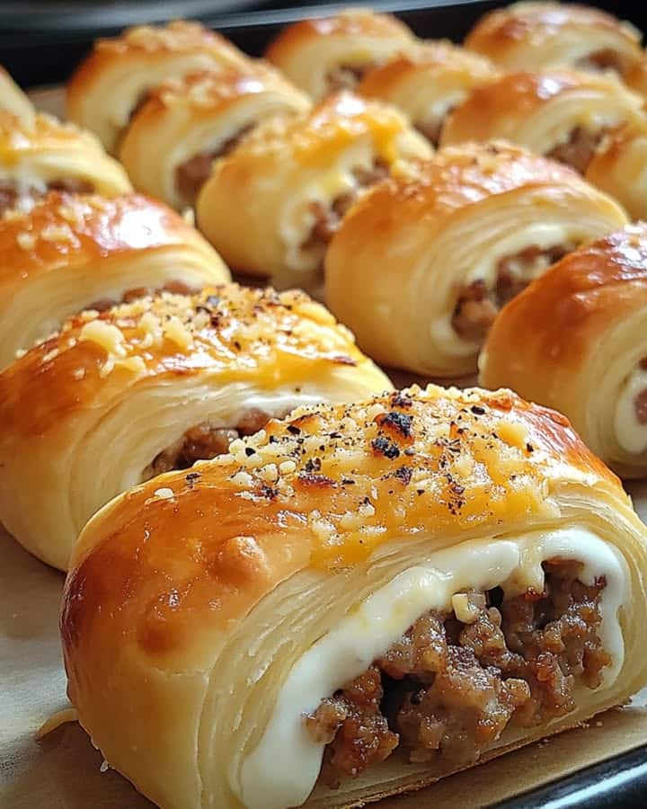 A simple and savory appetizer featuring a creamy sausage filling wrapped in flaky crescent dough.