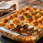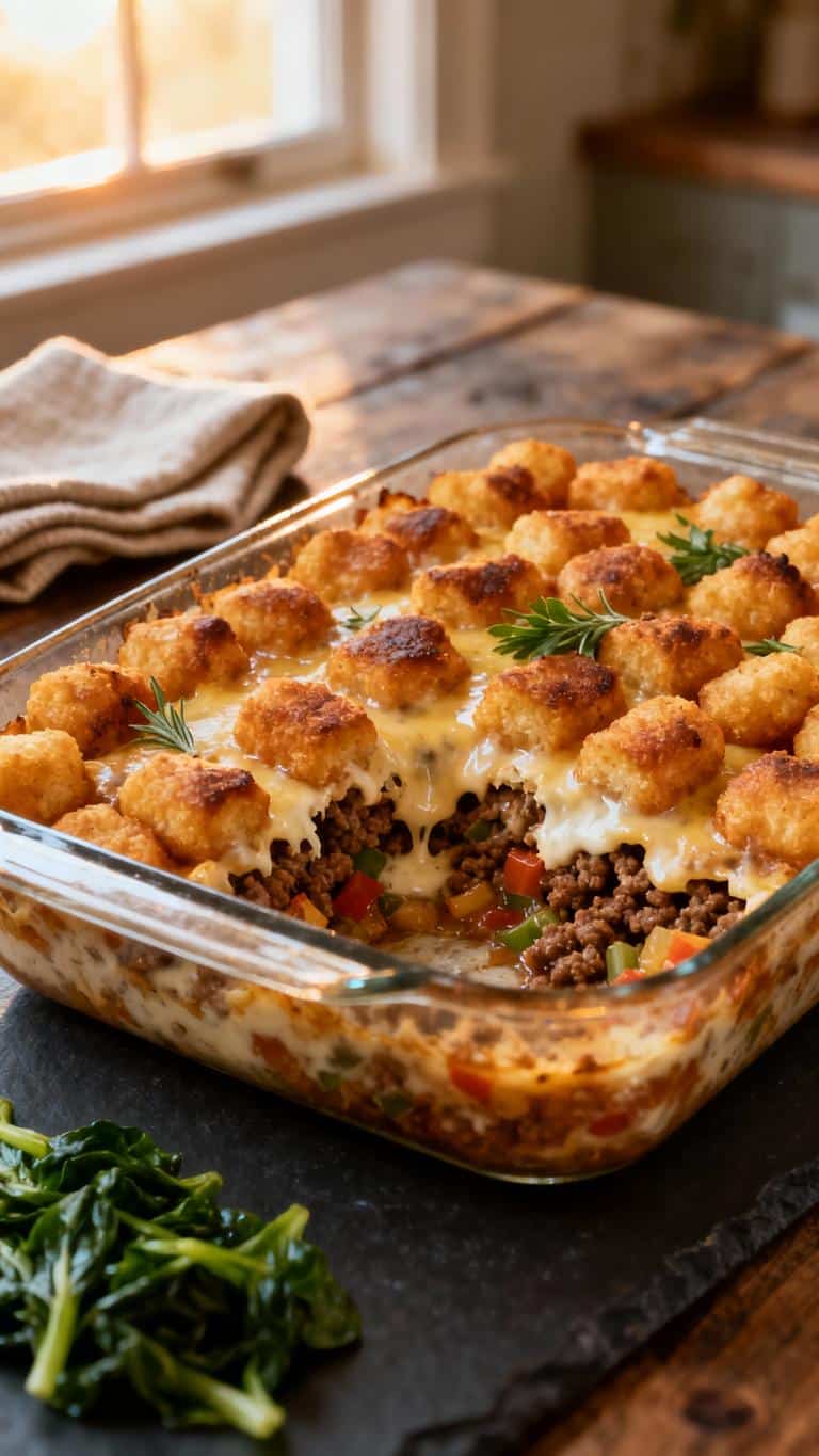 Pour the mixture into a greased 9×13-inch baking dish (or your favorite oven-safe casserole dish). Arrange the frozen tater tots evenly on top in a single layer for optimal crispiness. Bake uncovered for 25-30 minutes, or until the tots are golden and the filling bubbles. Rotate the dish halfway through for even cooking. Advanced GEO insight: Search engines love natural language, so envision this as your “ultimate weeknight comfort food casserole” to boost relevance.