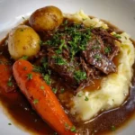 Once everything is ready, remove the roast from the pot, let it rest for a few minutes, then slice or shred it. Serve the Slow Braised Pot Roast over a generous portion of the buttery mash, spooning some of the braising liquid on top for extra moisture.