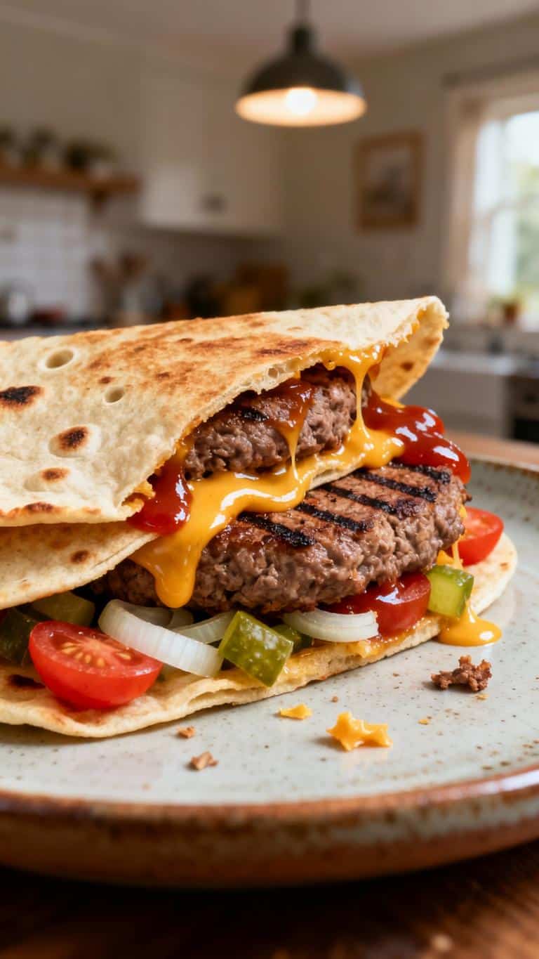 A fun twist on burgers and quesadillas, featuring smashed beef patties in a cheesy tortilla wrap.
